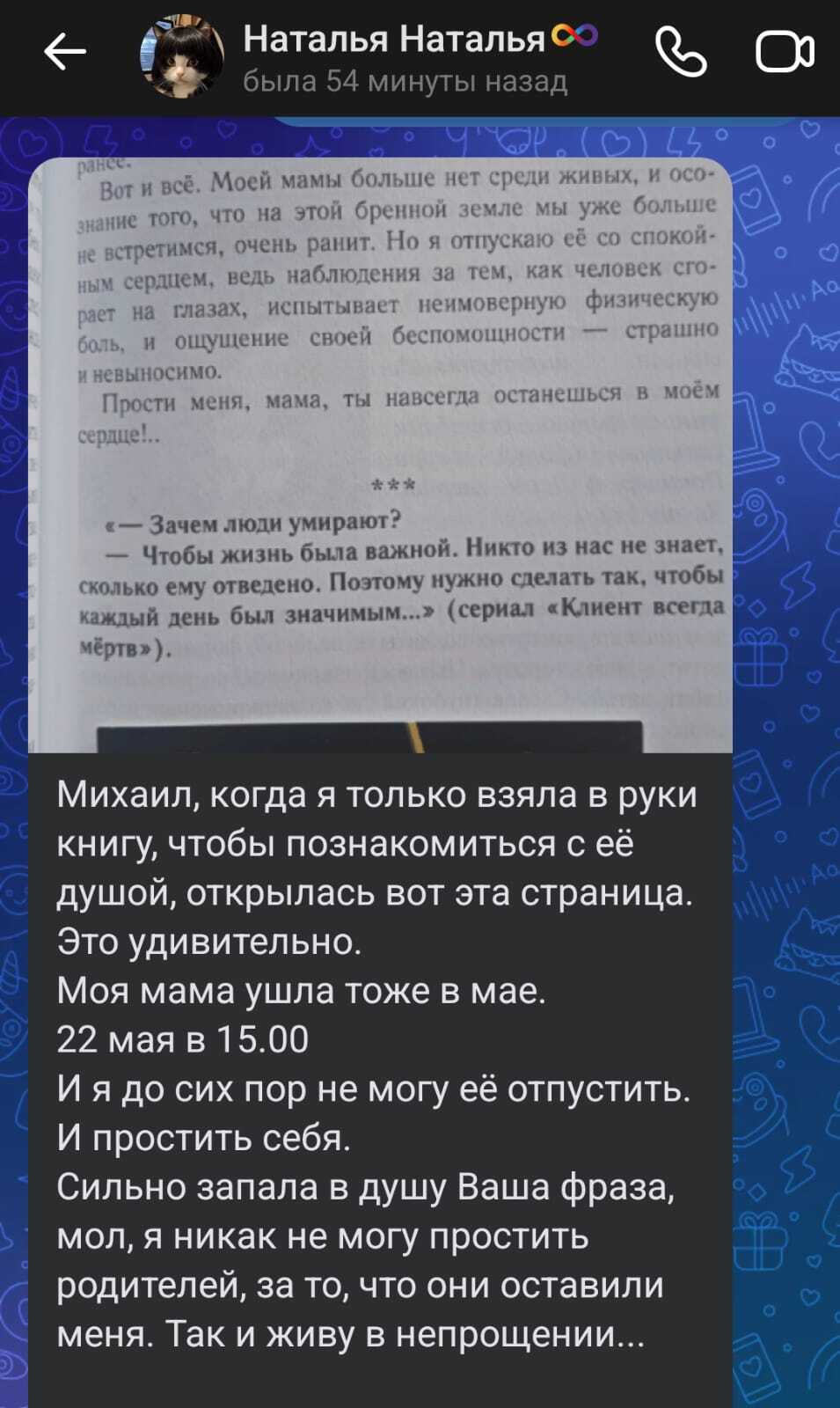 Третью книгу я начал писать в конце 2021 года и закончил в середине 2022‑го. «Искупление проклятья» стала завершающей частью трилогии. В ней я просто рассказал о своей семье, о предках, начиная с конца XIX века и до наших дней. Это был гештальт моих предков, который я должен был закрыть. Через эту книгу я попросил прощения у всех, кому причинил боль, и, самое главное, смог простить себя и отпустить ушедших людей.